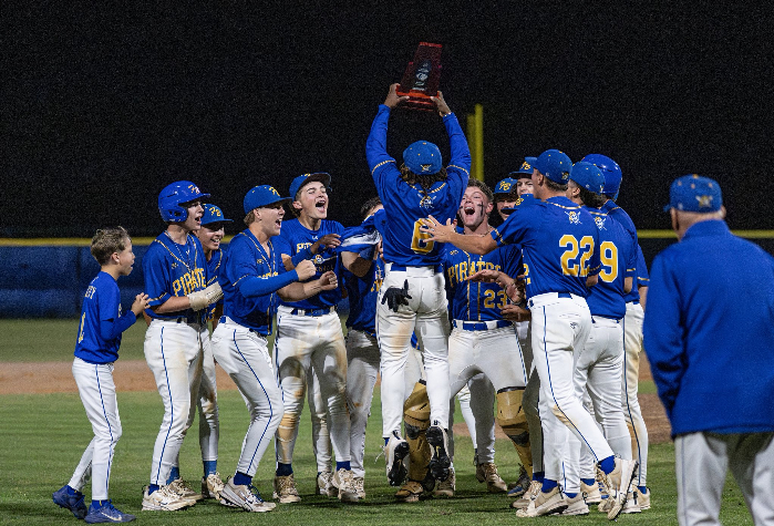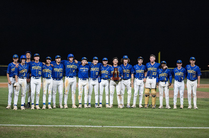 The Pirates celebrate their district championship trophy. *Photo from @DugoutClubofFernandinaBeach.